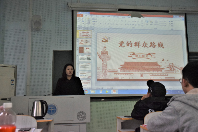2016级本科生辅导员兼院团委副书记单湉艺老师为大家讲解党的群众路线的形成,她结合三个关于群众路线的短视频向大家生动形象地展现了什么叫做“群众路线”,群众路线的形成、发展过程,以及定义、理论背景、实践背景等。