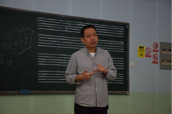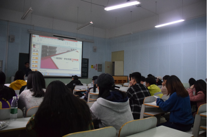 党委副书记吴仁喜讲解的艺媒学院党建工作机制,他详细地讲解了“一驱四轮”的学生党建工作机制和“五位一体”的工作保障,并向大家介绍了重新调整后的党支部组织结构,党支部的规范与命名,并向大家介绍了学院党委、学生党建办公室、学生党支部、支部党小组、团支部各自的工作职责、党委委员组成及各自分工。