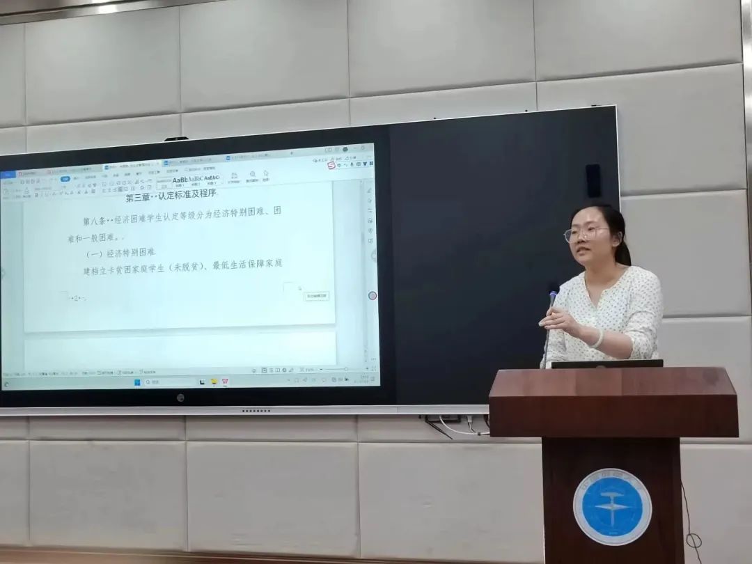 曾老师首先对家庭经济困难学生认定管理办法进行了详细的讲解和介绍,重点强调了经济困难学生认定等级及程序,并对认定工作的流程和纪律提出了要求,进一步明确了困难认定的注意事项。在谈到困难认定的过程监督时,曾老师提出了“应认尽认,不漏一人”、“保护隐私,保障安全”和“公平公正,认真负责”三条准则,以切实达到学校精准资助的要求与目标。此外,对于评议小组的系统操作、审批等具体的流程,会上也一一进行了讲解并对同学们提出的问题进行了解答。